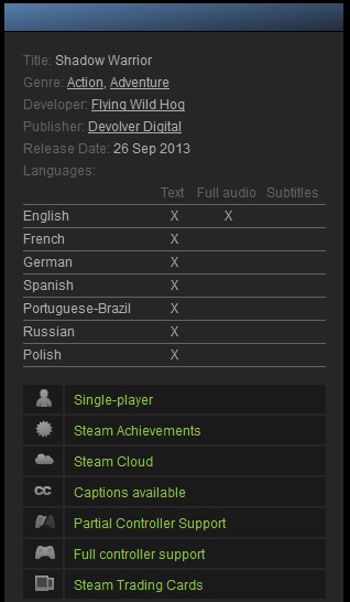 Shadow Warrior is a bold reimagining of the classic 3D Realms’ shooter from independent developer Flying Wild Hog (Hard Reset) starring the legendary and quick-witted warrior Lo Wang. Combine the brute force of overwhelming firepower with the elegant precision of a katana to annihilate the merciless armies of the shadow realm in an exhilarating and visually stunning transformation of the classic first-person shooter.
