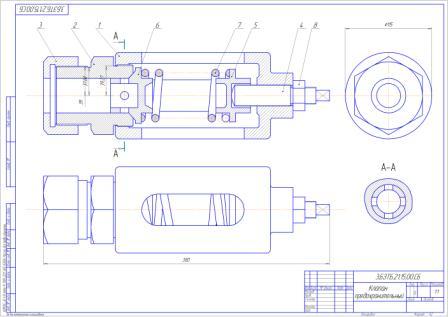 Чертежи клапана предохранительного. Есть сборка, спецификация, деталировка. Чертежи в программе компас 13, часть чертежей деталировки в программе автокад.