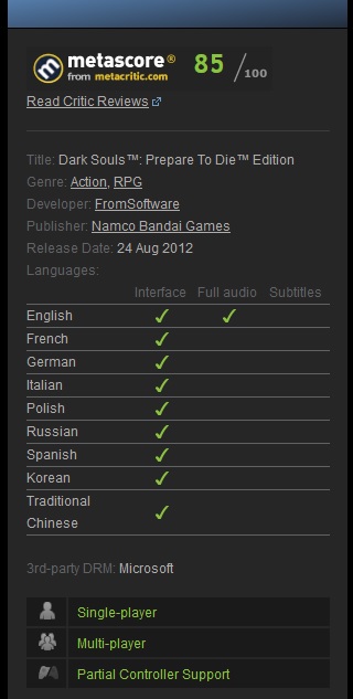 Dark Souls – новая ролевая игра от компании FromSoftware, создавших игру Demon’s Souls. В Dark Souls вы встретите множество знакомых элементов: вселенная в стиле "темного фэнтези", мрачные подземелья, сражения с наводящими ужас врагами и уникальные возможности взаимодействия с другими игроками. Dark Souls – это не прямое продолжение Demon´s Souls, а скорее духовный наследник игры. Приготовьтесь увидеть новый, погрузившийся в отчаяние мир, который вы сможете свободно исследовать. Приготовьтесь услышать новую загадочную историю, сюжет которой развивается вокруг королевской короны и угасающего пламени в сердце мира. Но прежде всего, приготовьтесь умереть. Вас ждет множество смертельных ловушек, полчища гротескных монстров, невероятно могущественные демоны и драконы. Чтобы справиться с испытаниями этого неумолимого мира, вам придется учиться на смертельных ошибках. Но вы будете не одни. В Dark Souls в вашем мире могут появляться души других игроков, чтобы вы могли учиться на их неудачах, а они, в свою очередь, на ваших. К тому же вы сможете призывать игроков или вторгаться в чужие миры, чтобы сражаться в PVP-битвах. В Dark Souls есть костры, которые играют роль точек сохранения. Во время отдыха у костра ваше здоровье и мана восстанавливаются, а все враги возрождаются. Помните: в Dark Souls нет ни одного по-настоящему безопасного места.