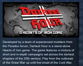 Darkest Hour – это самостоятельная игра на основе Hearts of Iron, разработанная командой опытных моддеров с форума Paradox. Игра представляет собой набор коротких и масштабных кампаний, раскиданных по самым мрачным главам истории двадцатого века. Играйте с самого начала Великой войны и вплоть до начала Холодной.