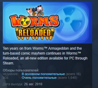 Спустя десять лет после выхода Worms™ Armageddon, пошаговое комичное мессиво продолжается в переработанной Worms™ Reloaded, доступной для ПК на Steam. Worms™ Reloaded предлагает вашему вниманию многопользовательскую игру до четырех человек и с компьютером, поддержку голосовой связи, связку новых сумасшедших оружий (и это не считая некоторые самые запоминающиеся оружия из предыдущих частей серии), достижения, таблицу рекордов, новые фоновые темы в высоком разрешении, обширный список замков для нового режима «Замок», новые редактор ландшафта, новые режимы игры, шляпы, костюмы и голосовые наборы червячков.