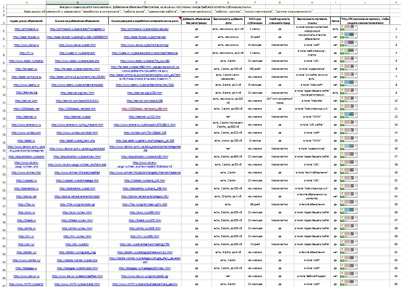 Файл может действительно оказаться полезным. Вам не нужно искать в гуглях и яшках жирные доски с высоким ТИЦ. Достаточно приобрести таблицу и приступить к добавлению объявлений на качественные доски.