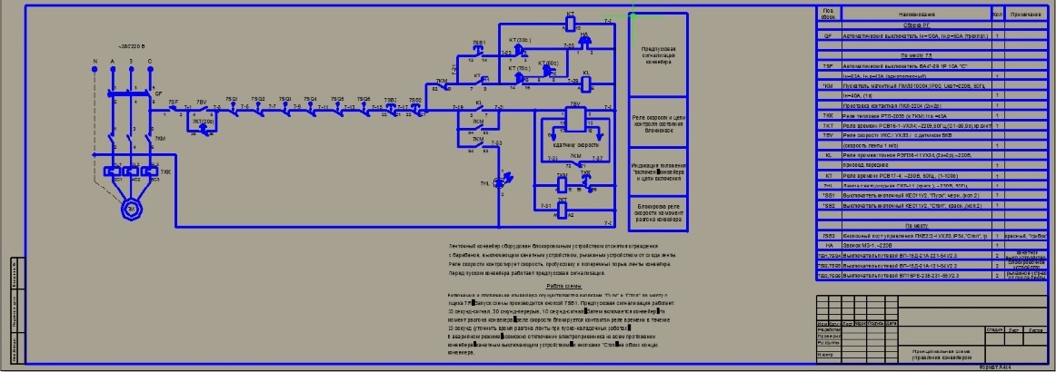Принципиальная схема управления конвейером. Блокировки, защита, реле скорости, устройство пуска конвейера. Как включается-отключается, сигнализация. Выбрано электрооборудование. Мощность двигателя 18,5кВт.