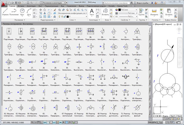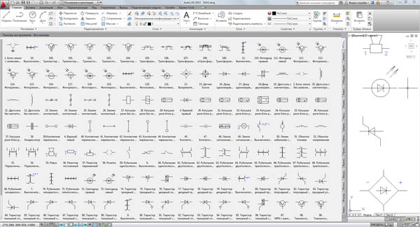 Коллекция содержит 194 условно-графических обозначения электротехнических устройств в формате AutoCAD DWG, применяемых при проектировании однолинейных схем главных и вторичных электрических цепей.