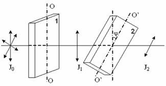 76. Определите, во сколько раз уменьшится интенсивность естественного света, прошедшего через два николя, главные плоскости которых образуют угол в 60°, если каждый из николей как поглощает, так и отражает 5% падающего на них света.