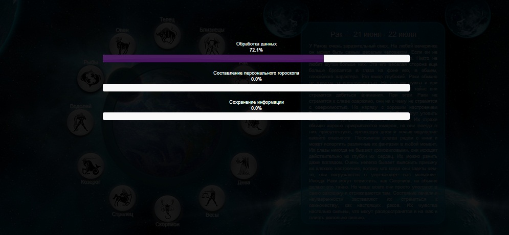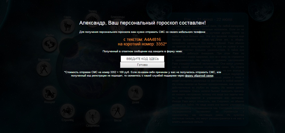 Движок СМС - платник гороскопа. В чём заключается смысл данного сайта? Пользователь заходит на сайт, вводит свои данные и чтобы получить гороскоп должен отправить платное СМС. Вся информация на сайте составлена профессиональными астрологами. Установка, подключение коротких номеров прилагается.