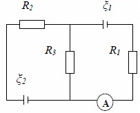 83. В схеме, представленной на рисунке, ξ1=110В, ξ2=220В, R1 = R2 = R = 100 Ом, R3 = 500 Ом. Найти показание амперметра. Внутренними сопротивлениями амперметра и элементов пренебречь.