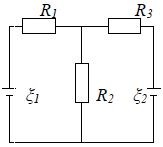 76. Определить силу тока I3 в резисторе сопротивлением R3 и напряжение U3 на концах резистора, если ε1 = 4 В, R1 = 2 Ом, ε2 = 3 В, R2 = 6 Ом, R3 = l Ом. Внутренними сопротивлениями амперметра и источников тока пренебречь.