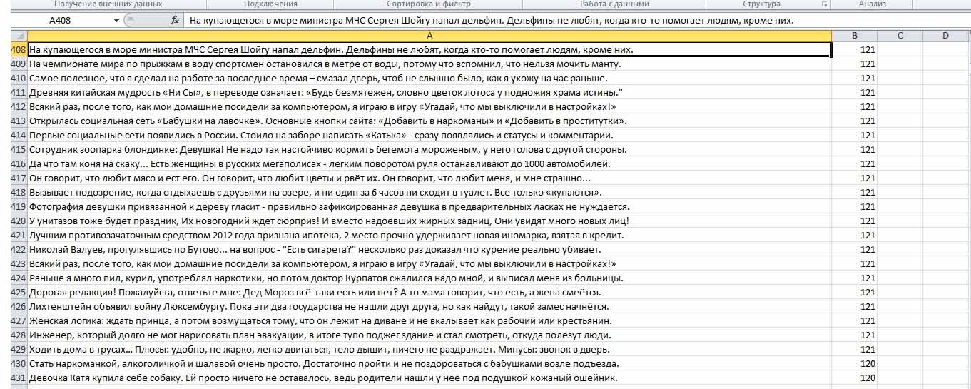 После покупки вы получите файл excel из двух столбцов, в первом - сама шутка, во втором - количество символов. Шутки отсортированы по убыванию количества символов в них