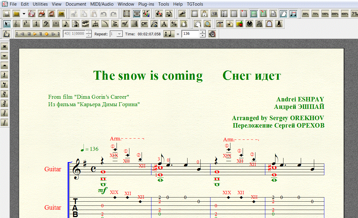 Исполнено и записано на обычной гитаре с MIDI-датчиком Shadow SH 075 с последующей редакцией MIDI-протокола в Finale для публикации гитарных нот в электронном виде. По сему, нет смысла предъявлять претензии к демо-аудио, постольку, поскольку… :)))
