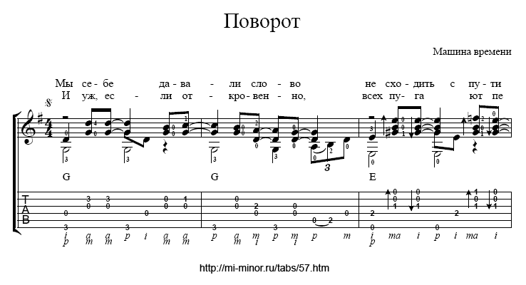 Аранжировка песни «Поворот» (Группа «Машина времени») для одной гитары.