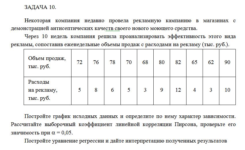 Через 10 недель компания решила проанализировать эффективность этого вида рекламы, сопоставив еженедельные объемы продаж с расходами на рекламу (тыс. руб.).