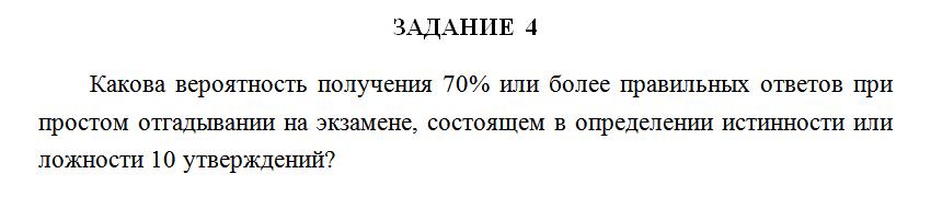 Какова вероятность получения 70% или более правильных ответов при простом отгадывании на экзамене, состоящем в определении истинности или ложности 10 утверждений?