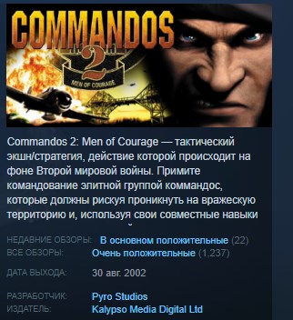 Commandos 2: Men of Courage — тактический экшн/стратегия, действие которой происходит на фоне Второй мировой войны. Примите командование элитной группой коммандос, которые должны рискуя проникнуть на вражескую территорию и, используя свои совместные навыки выполнить серию миссий. Проникните в новые окружения, основанные на достоверных местах Второй мировой войны: сердце Третьего рейха, северо-европейское расположение субмарин, штаб японской армии и многие другие.