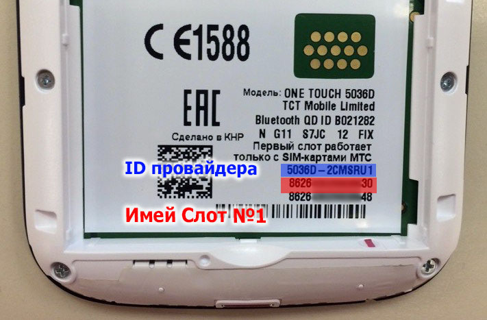 Нужен ID провайдера его можно найти также как и имей на наклейке, сняв аккумулятор. Выглядит он: 5036D-2AMSRU1, 5036D-2BMSRU1, 5036D-2СMSRU1 в вашем конкретном случае может отличаться.
