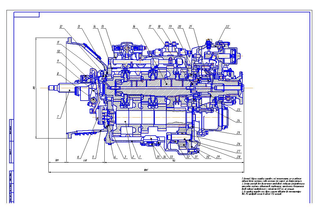 Чертеж коробки передач ЯМЗ 239 выполнен на листе формата А1 в программе Компас-3Д V10, с техническими требованиями