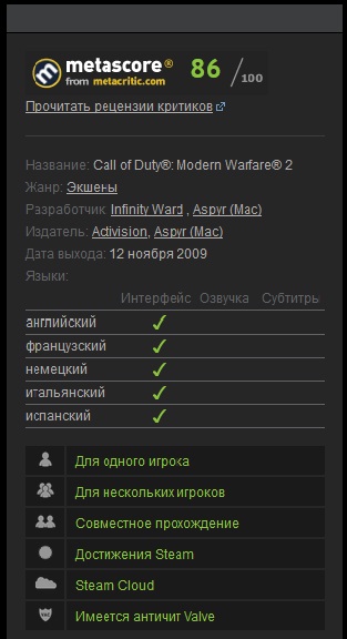 Впервые в истории видеоигр музыкальное сопровождение для Call of Duty®: Modern Warfare 2 написано многократным обладателем наград Американской Киноакадемии, Золотой глобус, Грэмми и Тони, легендарным композитором Хансом Циммером. Действия игры разворачиваются сразу же после событий Call of Duty® 4: Modern Warfare® — игры, завоевавшей множество положительных оценок от критиков со всего мира, в том числе: