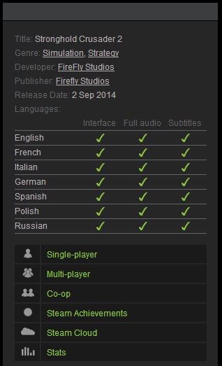 Stronghold Crusader 2 is the long awaited sequel to Stronghold: Crusader, the original ´castle sim´. After 12 years Stronghold returns to the deserts of the Middle East circa 1189, with a new 3D engine and realistic castle destruction powered by Havok Physics. Crusader 2 will recapture the original game’s addictive, fast-paced gameplay and authentic castle simulation.