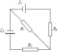 22. Найти силу тока во всех участках цепи, представленной на рисунке. (ξ1 =2,1 В, ξ2 = 1,9 В, R1 = 45 Ом, R2 = 10 Ом и R3 = 10 Ом). Внутренним сопротивлением элементов пренебречь.