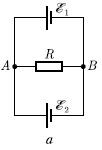 23. Два источника, ЭДС которых ε1 = 2 В ε2 = 4В, соединены, как показано на рис. а. Внешнее сопротивление R = 1 Ом, а внутренние сопротивления источников r1 = r2 = 0,5 Ом. Определите силы токов, протекающих через источники и внешнее сопротивление.