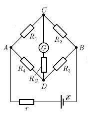 26. В приведенной на рисунке электрической схеме моста Уитстона заданы сопротивления R2, R3, R4, электродвижущая сила ε источника тока и его внутреннее сопротивление r. Определите сопротивление R1 если известно, что ток в цепи гальванометра G отсутствует (IG = 0). Сопротивление гальванометра равно RG.