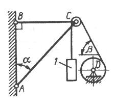 ного на барабан лебедки D. Определить усилие в стержне АС, если углы ?= 45°, ?= 60°. (Ответ -26,4)