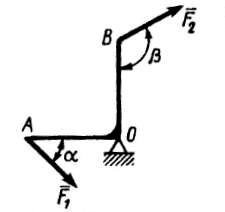 Определить модуль силы F2, необходимой для того, чтобы удержать рычаг в равновесии, если углы ?=45°, ?=120°, длины АО = 0,5 м, ВО = 0,6 м.