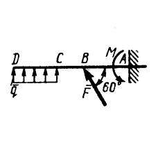 Определить интенсивность q распределенной нагрузки, при которой момент в заделке А равен 546 Н·м, если сила F = 173 Н, момент пары сил М = 42 Н·м, размеры АВ = СD = 2м, ВС= 1 м. (Ответ 36,0)
