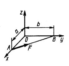 Определить момент силы F относительно оси Ох, если сила F = 20Н пересекает оси Ох и Оу на расстояниях а = 2 м и b = 3 м. (Ответ 0)