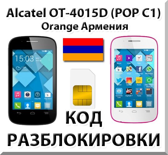 Данный товар предназначен для разблокировки смартфона Alcatel OT-4015D (Alcatel OneTouch Pop C1) от оператора Orange (Армения). Для оформления покупки вам потребуется знать IMEI вашего аппарата (15 цифр), а также ID провайдера (Provider ID). Эту информацию можно найти на наклейке под батареей. Поддерживаются только следующие Provider ID: 4015D-2ARGAM3, 4015D-2BRGAM3, 4015D-2CRGAM3, 4015D-2DRGAM3, 4015D-2GRGAM3, 4015D-2HRGAM3, 4015D-2IRGAM3.