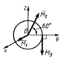 Определить модуль момента равнодействующей пары сил для системы трех пар сил с моментами М1=2 Н·м, М2 = М3 = 3 Н·м. Векторы М2 и М3 расположены в плоскости Oyz, а М1 || Ох (Ответ 2,53)