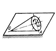 Прямой круговой конус катится без скольжения по горизонтальной плоскости, имея угловую скорость ? = 5 рад/с во вращательном движении вокруг мгновенной оси вращения. Момент инерции конуса относительно оси ОА равен 0,04 кг • м2. Определить кинетическую энергию конуса. (Ответ 0,5)