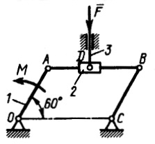 На шатун АВ шарнирного параллелограмма ОАВС надета втулка 2, к которой с помощью шарнира D прикреплен вертикальный стержень 3. Определить в случае равновесия механизма момент М пары сил, если сила F = 400Н и длина кривошипа ОА = 0,2 м. (Ответ 40)