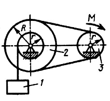 Определить модуль момента М нары сил, который необходимо приложить к шкиву 3