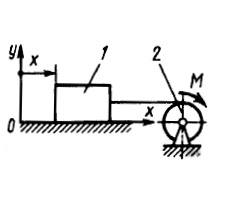 Тело 1 массой m = 30 кг и цилиндр 2 радиуса R = 0,25 м соединены нерастяжимым тросом. Определить обобщенную силу, соответствующую обобщенной координате х, если коэффициент трения скольжения между телом 1 и поверхностью f = 0,2, а к цилиндру приложена пара сил с моментом М = 25 Н • м. (Ответ 41,1)