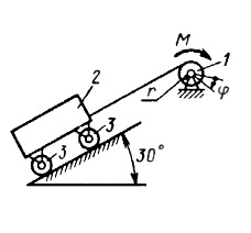 барабан 1 радиуса r = 0,1 м действует пара сил с постоянным моментом М = 50 H • м, масса