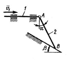 Стержень 1 в точке А шарнирно соединен со стержнем 2, который в точке В скользит по наклонной плоскости. Определить скорость точки В стержня 2 в положении, когда углы ? = ? = 30о и скорость v1 стержня 1 равна 0,6 м/с. (Ответ 0,346)