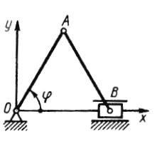 Определить ускорение точки Н в момент времени, когда угол ?=60°, если длина ОА = АВ = 20 см, а закон изменения угла ?=3t. (Ответ -1,8)