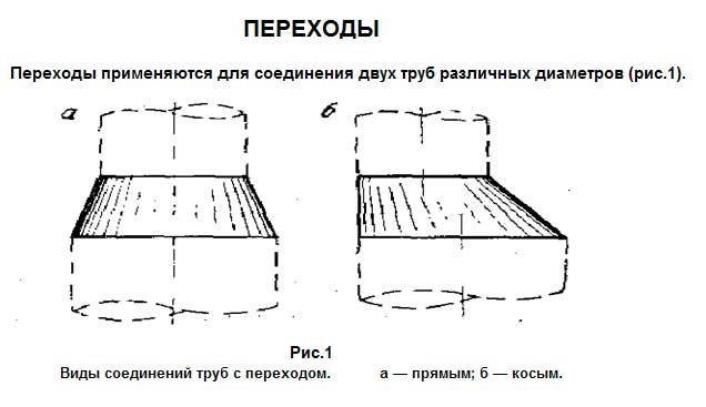 Переходы применяются для соединения двух труб различных диаметров и представляют собой усеченный конус, у которого верхнее основание параллельно нижнему основанию. Каждое основание представляет собой окружность. Переход изготавливается из листового материала (сталь, пластмасса) на сварку. Для изготовления перехода необходимо сделать соответствующую разметку листового материала, т. е. построить на листовом материале развертку перехода, затем развертку вырезать и сварить, образуя переход. При вырезке следует дать допуск на обработку кромок. Переход соединяется с трубами на сварку. Таким образом, разметка перехода сводится к построению его развертки на листовом материале.