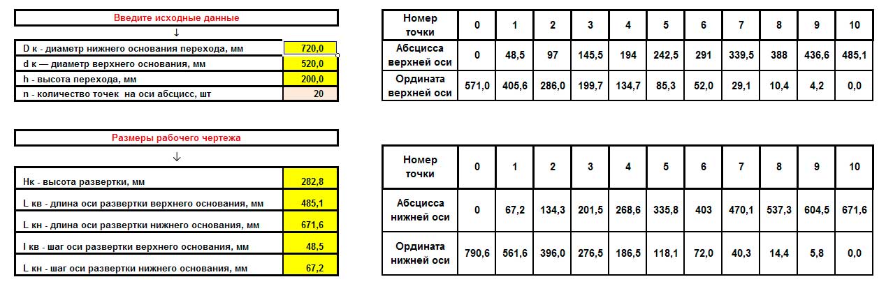 Предлагаемая таблица Excel рассчитывает размеры развёрток любых косых переходов с недоступной вершиной, у которых (D-d)/h <= 1, 15; где d - диаметр верхнего основания; D - диаметр нижнего основания; h - высота перехода;