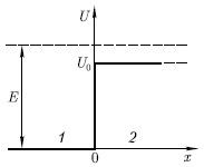 25. Частица массой m движется в положительном направлении оси х и встречает на своем пути бесконечно протяженный прямоугольный потенциальный порог высотой U0. Энергия частицы Е > U0 (см. рисунок). Запишите уравнение Шредингера для стационарных состояний частицы, найдите его решения и определите коэффициенты отражения и прозрачности.