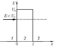 32. Частица массой m с энергией Е движется в положительном направлении оси х и встречает на своем пути прямоугольный потенциальный барьер высотой U0 и шириной l. Энергия частицы Е < U0 (см. рисунок). Зашипите уравнения Шредингера для стационарных состояний частицы и найдите их решения.