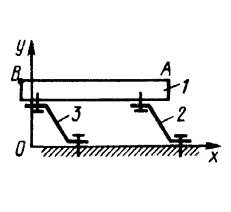 Вибролоток 1, закрепленный на двух плоских пружинах 2 и 3, совершает поступательное движение по закону ХА = 0,16 sin 50 ?t, уА = 0,12 sin 50 ?t, где хА и уА - в см. Определить скорость в см/с точки В вибролотка в момент времени t = 1 с, если АВ = 100 см.(Ответ 31,4)
