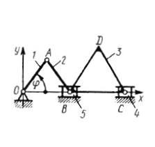 При вращении кривошипа 1 шатуном 2 приводятся в движение ползуны 4,5 и тре­угольная пластинка 3. В момент времени t = 0,5 с определить ускорение точки D если ОА = АВ = 0,2 м, ВС = CD = BD = 0,26 м, угол ? = ?t. (Ответ 0)