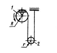 Барабан 1 вращается согласно закону ? = 0,3t2. Определить угловое ускорение блока 2, если радиусы R = 0,1 м, r = 0,06 м. (Ответ 0,5)