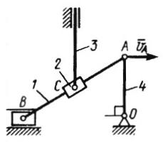 На шатун 1 кривошипно-ползунного механизма надета втулка 2. К точке С втулки шар­нирно прикреплен стержень 3. Для данного положения механизма определить скорость стержня 3, если длина ОА = 0,5 АВ и скорость точки А кривошипа 4 равна vA = 3 м/с. (Ответ 1,73)