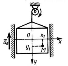 Кабина лифта поднимается с постоянным ускорением ае = 5 м/с2. Внутри кабины в плоскости чертежа движется точка М по зако­ну х1 = 0,5t2 и у1 = 0,3t2. Определить абсо­лютное ускорение точки М. (Ответ 4,51)