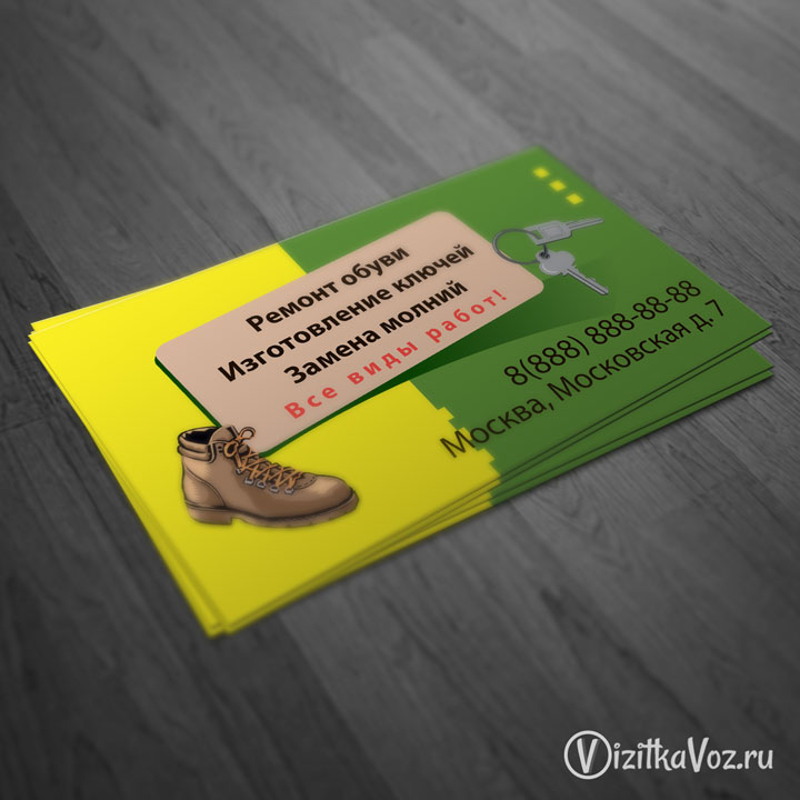 Симпатичная визитка для фирмы по ремонту обуви, изготовлению ключей, замене молний.