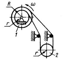 Барабан лебедки 1 вращается с угловой скоростью ? = 6 рад/с. Определить угловую скорость поднимаемом трубы 2, если отноше­ние радиусов r/R = 2/3. (Ответ 1,5)