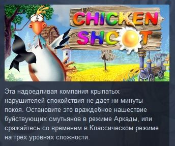 CHICKEN SHOOT классически смешной шутер с элементами приключения. Особо думать в нем не о чем … просто сбивайте цыплят. В каждой мисси Вы можете собрать дополнительные предметы и получить дополнительные очки за определенные игровые действия. Так что можно довольно легко, особенно на первых уровнях, заработать большое количество очков.